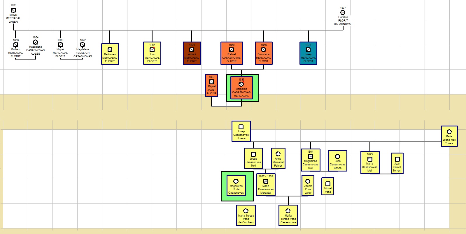 Tot i el elevat nombre de coincidències amb llocs, fets i dates, no he arribat a trobar el motiu de parentiu entre Maria Casasnovas Mercadal i Magdalena Casasnovas Mercadal, ja que ambdues, tot i portar el mateix cognom i de ser de Ciutadella/Ferreries, tenen pares diferents.
